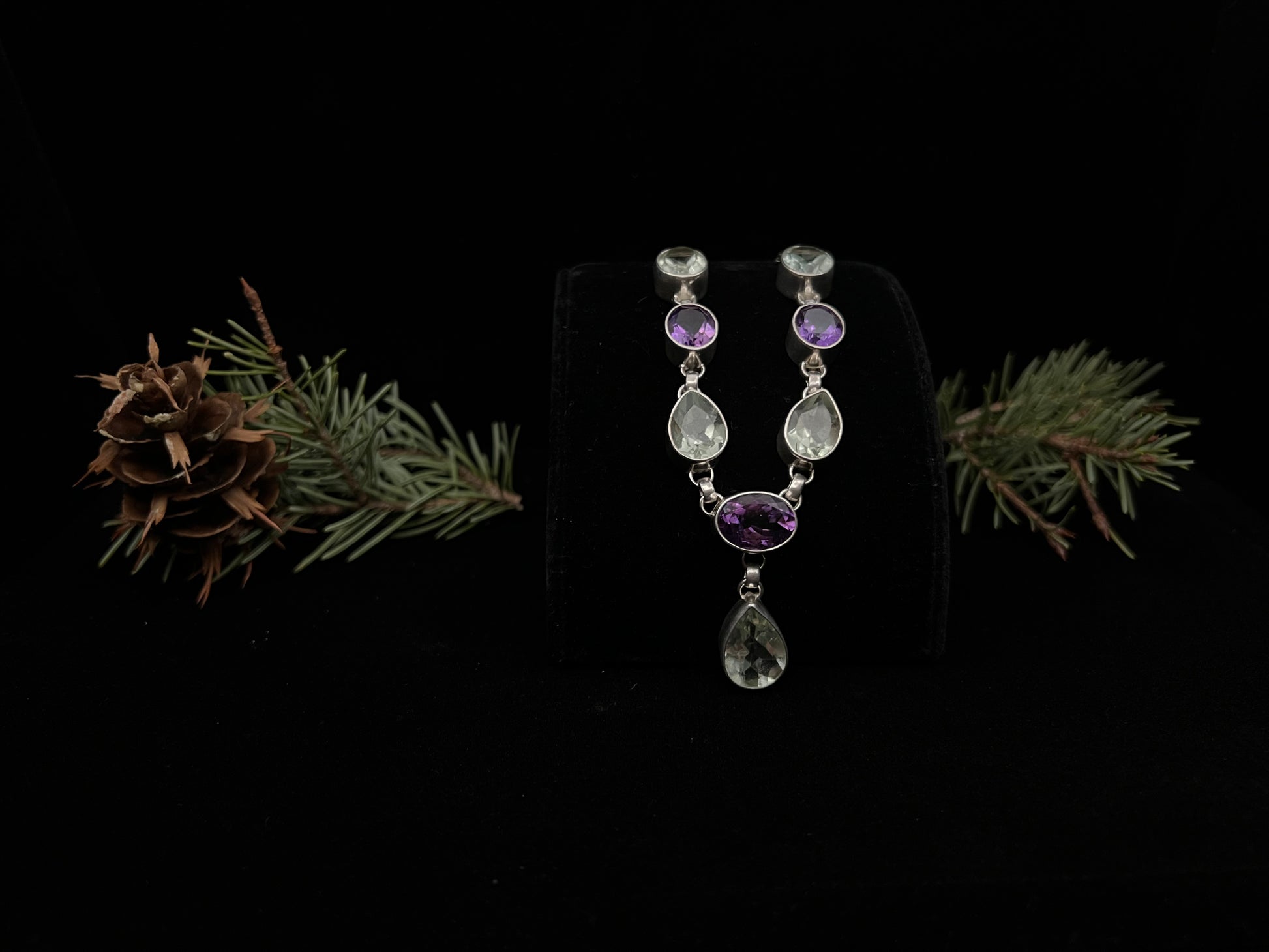 Stunning sterling silver green and purple amethyst drop necklace with heavy chain.