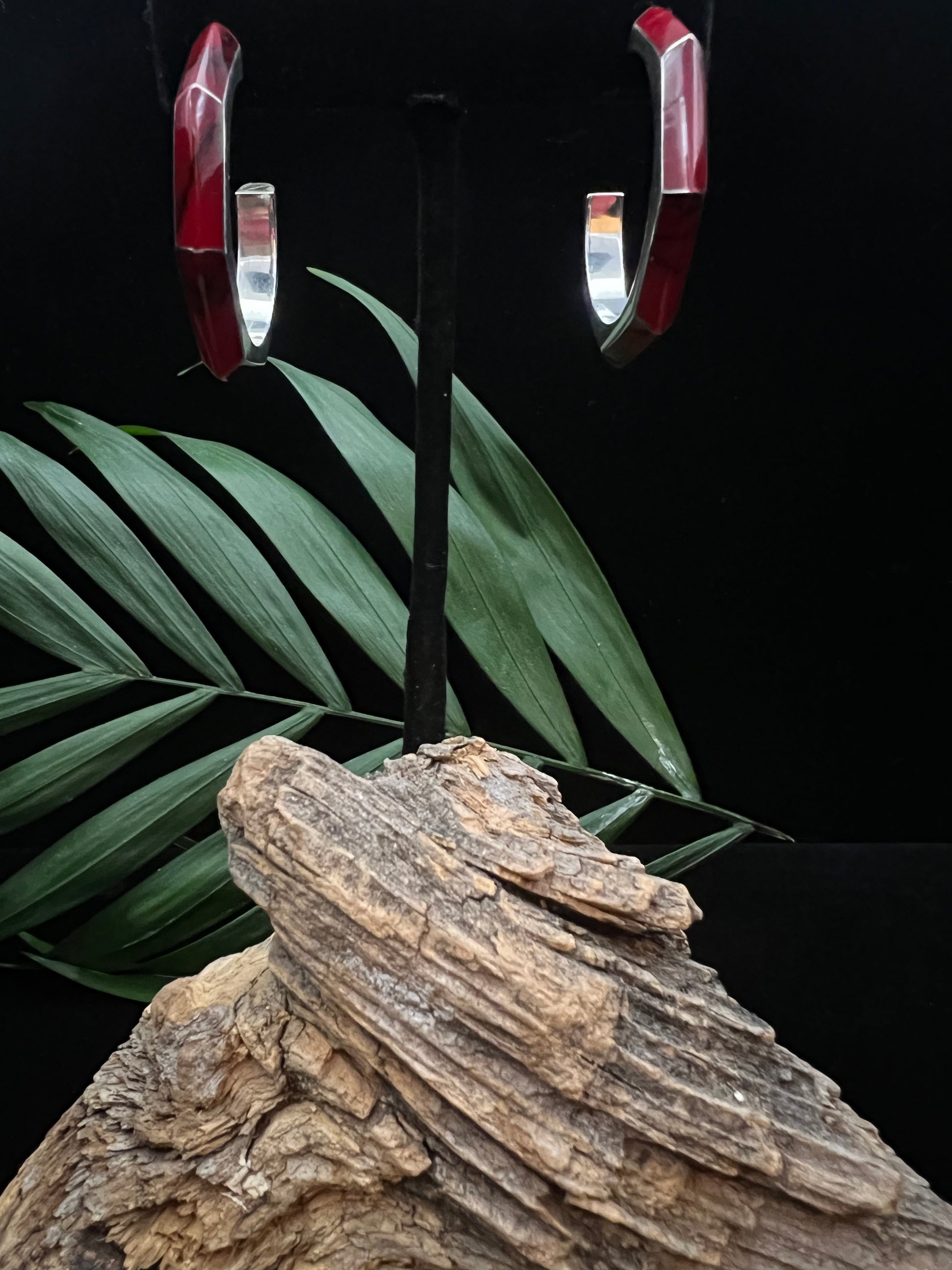 Sterling silver, red jasper, octagon hoops on post. Add a little color, perfect for the holidays and makes a great gift too!