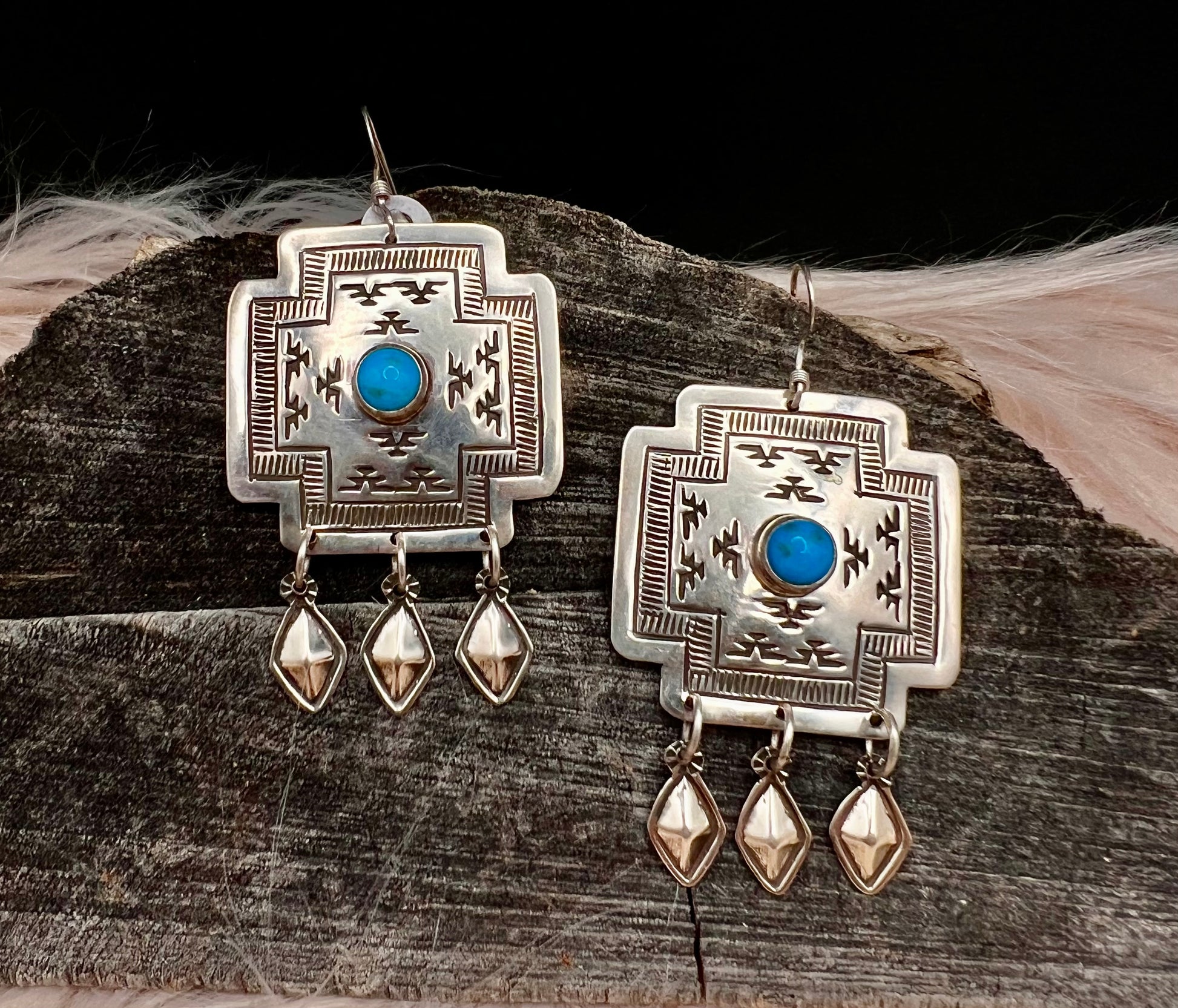 These eye-catching cross earrings are made with sterling silver and feature a stunning turquoise stone in the center. They delicately hang from French wires for a classic, southwestern look perfect for any occasion. Wear them and get noticed!