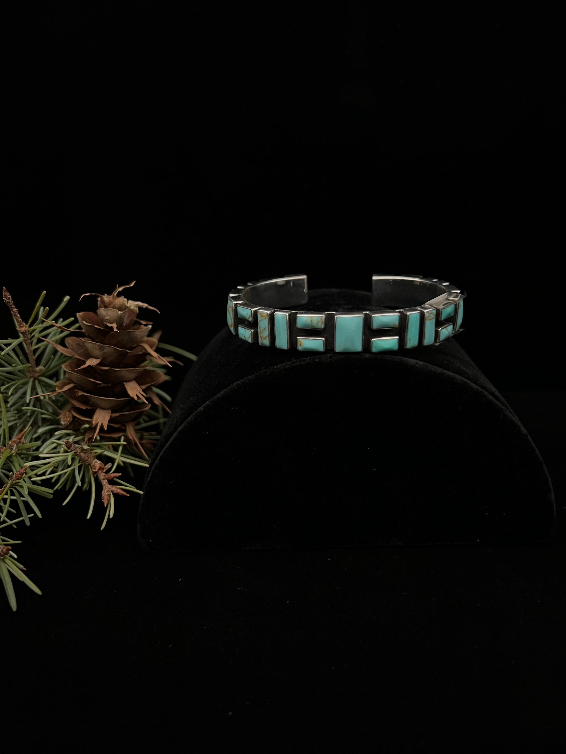 Medium size, sterling silver, mosaic turquoise cuff bracelet.